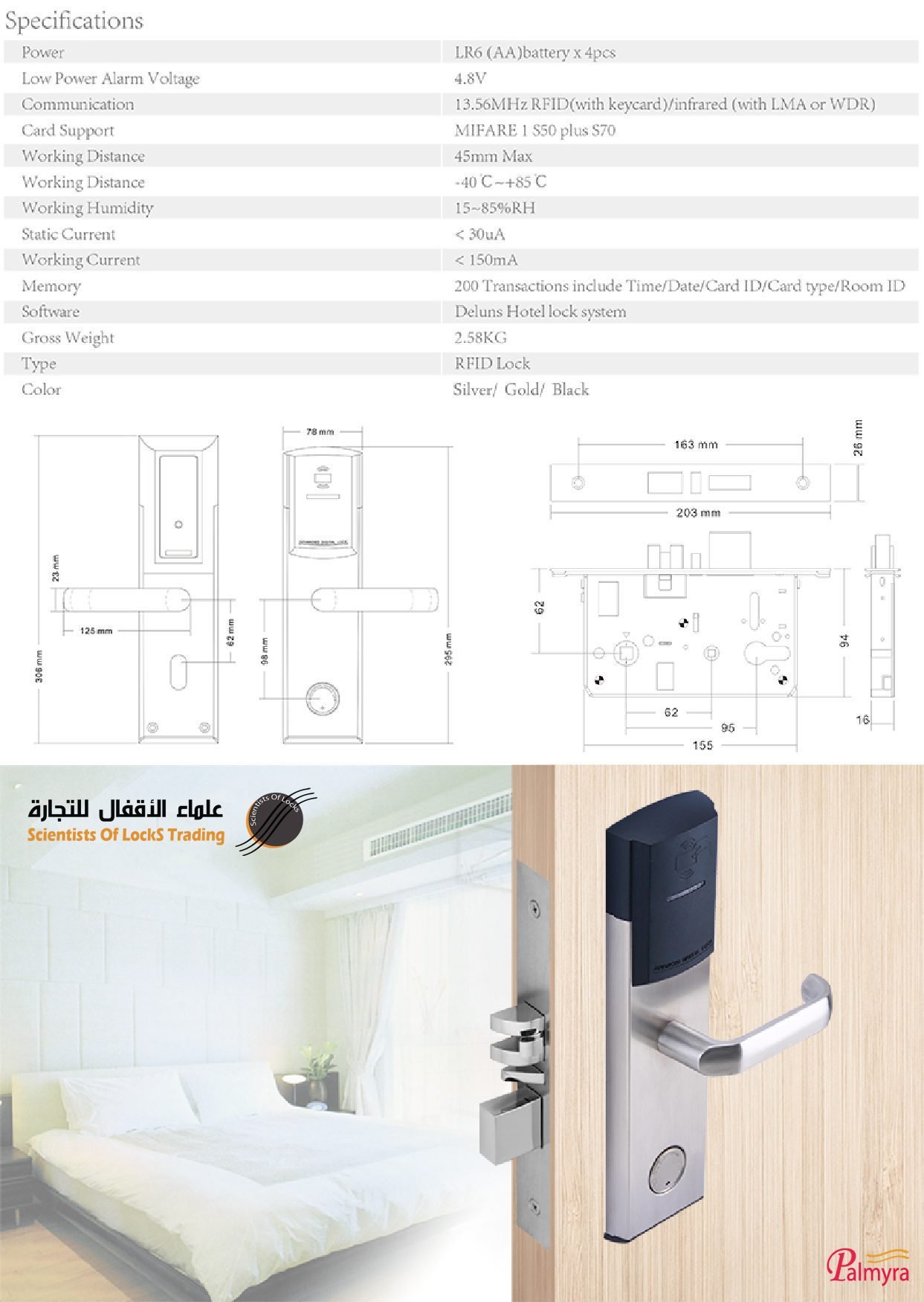 | مصدر الطاقة | 4 بطاريات AA – جهد 6V – عمر تشغيلي حتى 6,000 عملية تقريبًا |